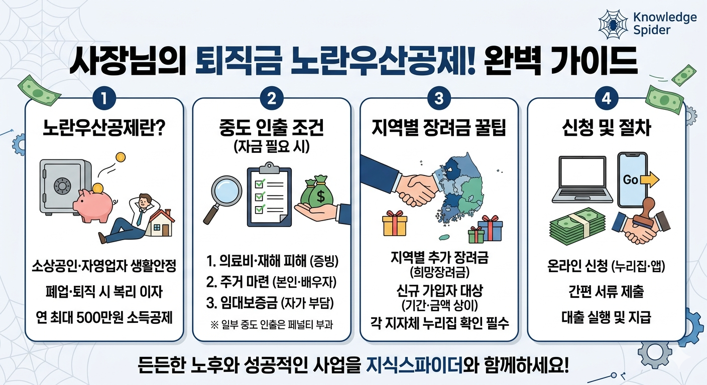 오늘 소개해 드린 중도 인출 조건과 지역별 장려금 혜택을 잘 메모해 두셨다가, 필요할 때 유용하게 활용하시길 바랍니다. 평택의 모든 사장님이 든든한 노후 자금을 마련하고 걱정 없이 사업에만 매진할 수 있는 그날까지, 지식스파이더가 항상 유익한 정책 정보로 함께하겠습니다. 오늘 글이 도움이 되셨다면 주변 사장님들께도 공유해 주세요!